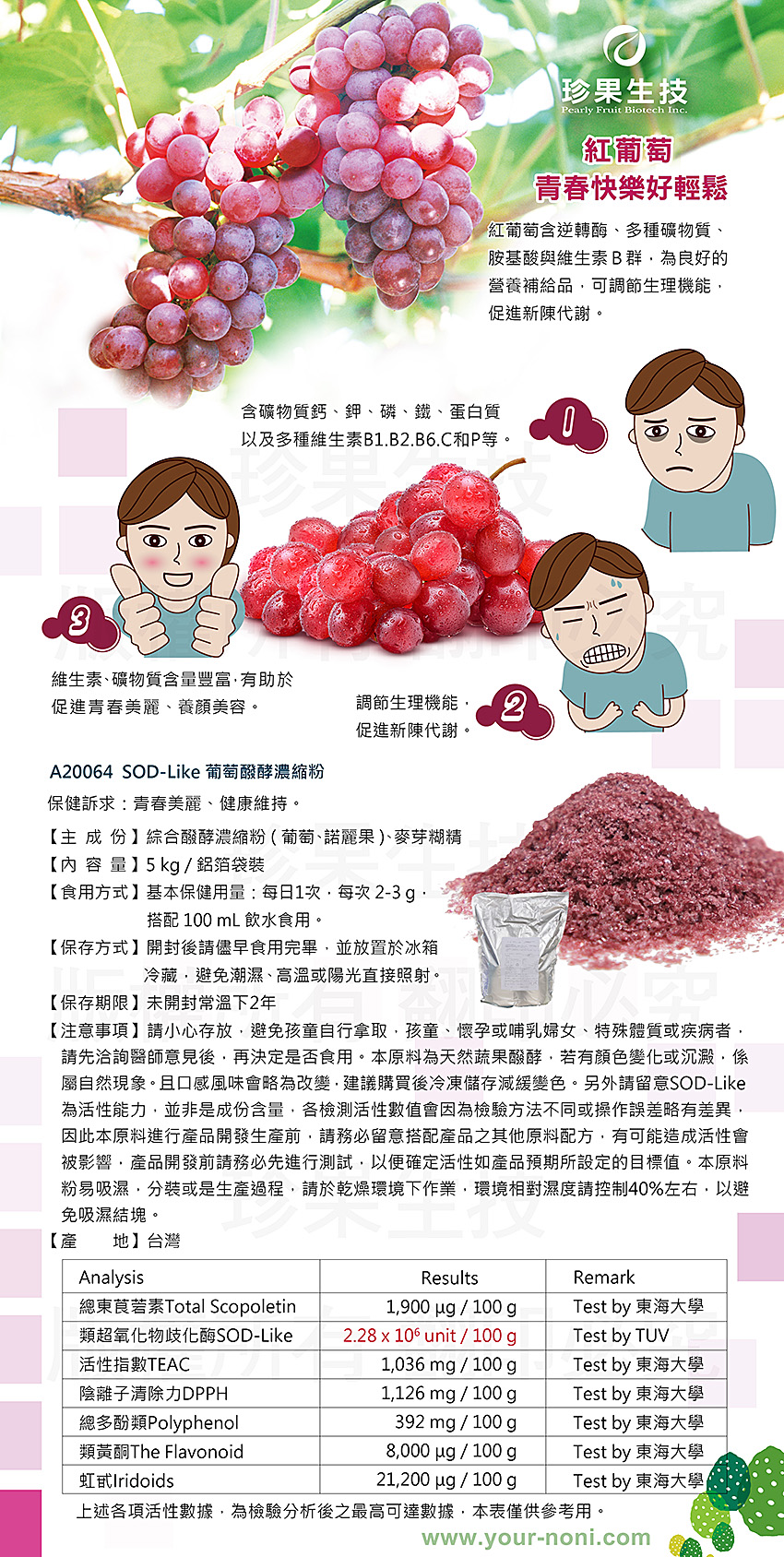 本原料一般消費者無法進行後續加工處理,僅供專業採購商參考,不開放給一般客戶購買,如有任何問題,請與本公司連絡,造成不便 敬請見諒。諾麗,SOD-Like,酵素