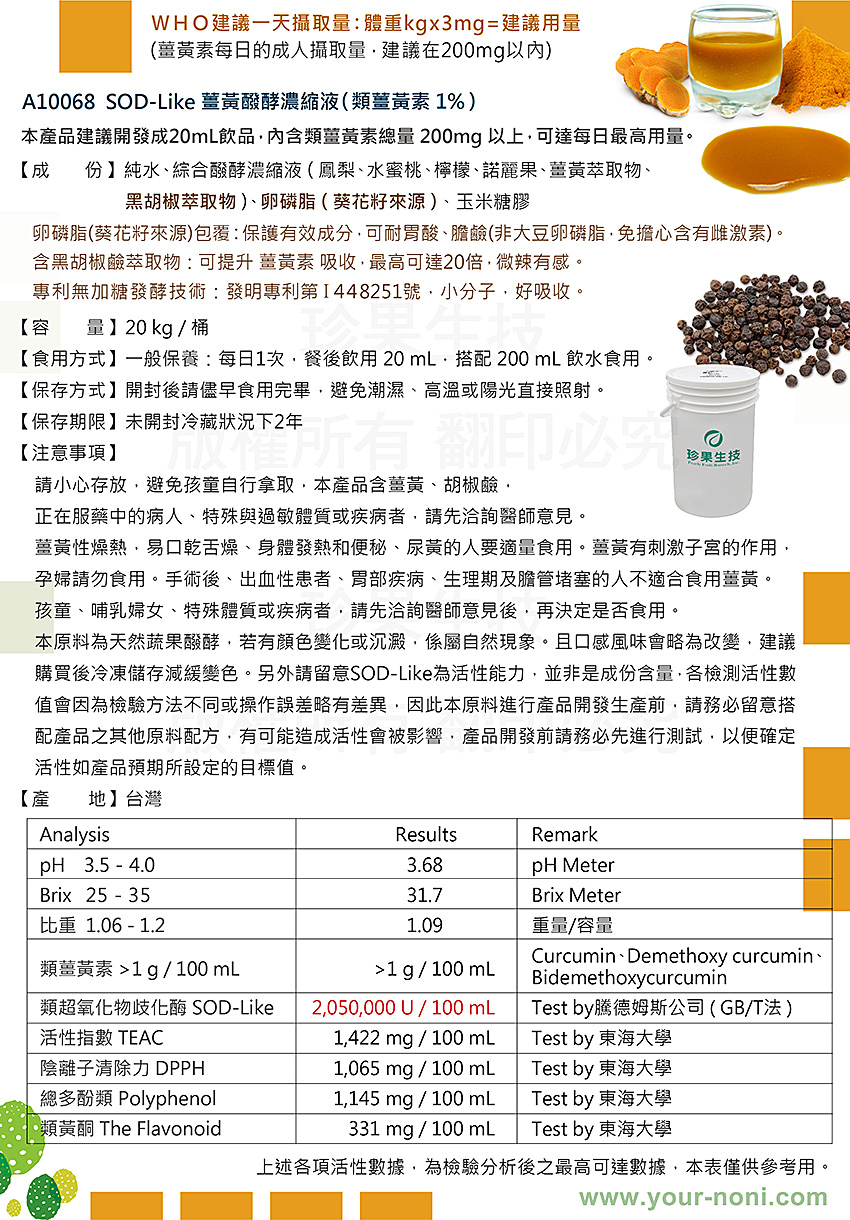 本原料一般消費者無法進行後續加工處理,僅供專業採購商參考,不開放給一般客戶購買,如有任何問題,請與本公司連絡,造成不便 敬請見諒。諾麗,SOD-Like,酵素