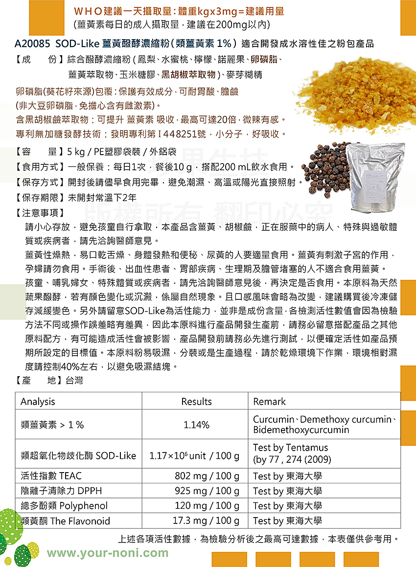 本原料一般消費者無法進行後續加工處理,僅供專業採購商參考,不開放給一般客戶購買,如有任何問題,請與本公司連絡,造成不便 敬請見諒。諾麗,SOD-Like,酵素