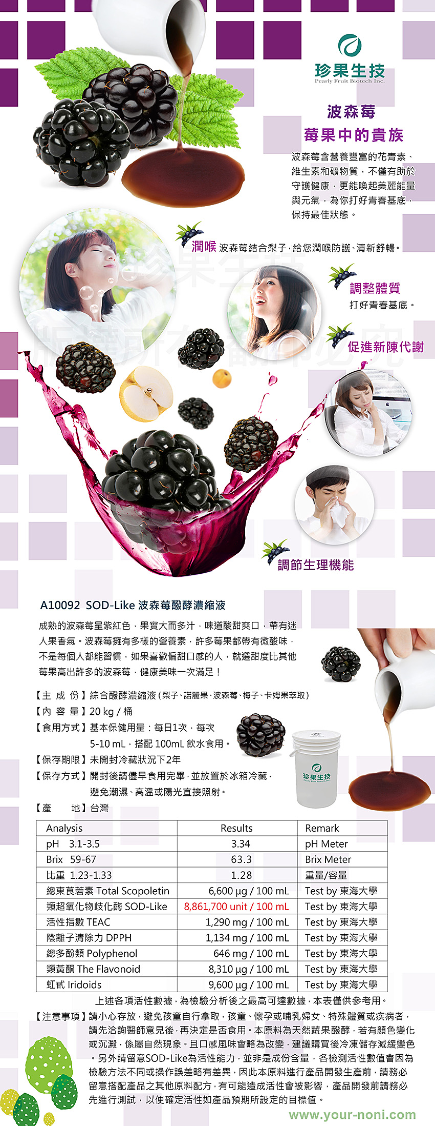 本原料一般消費者無法進行後續加工處理,僅供專業採購商參考,不開放給一般客戶購買,如有任何問題,請與本公司連絡,造成不便 敬請見諒。諾麗,SOD-Like,酵素,波森莓,sod,sod-like,活性,發酵,酵素