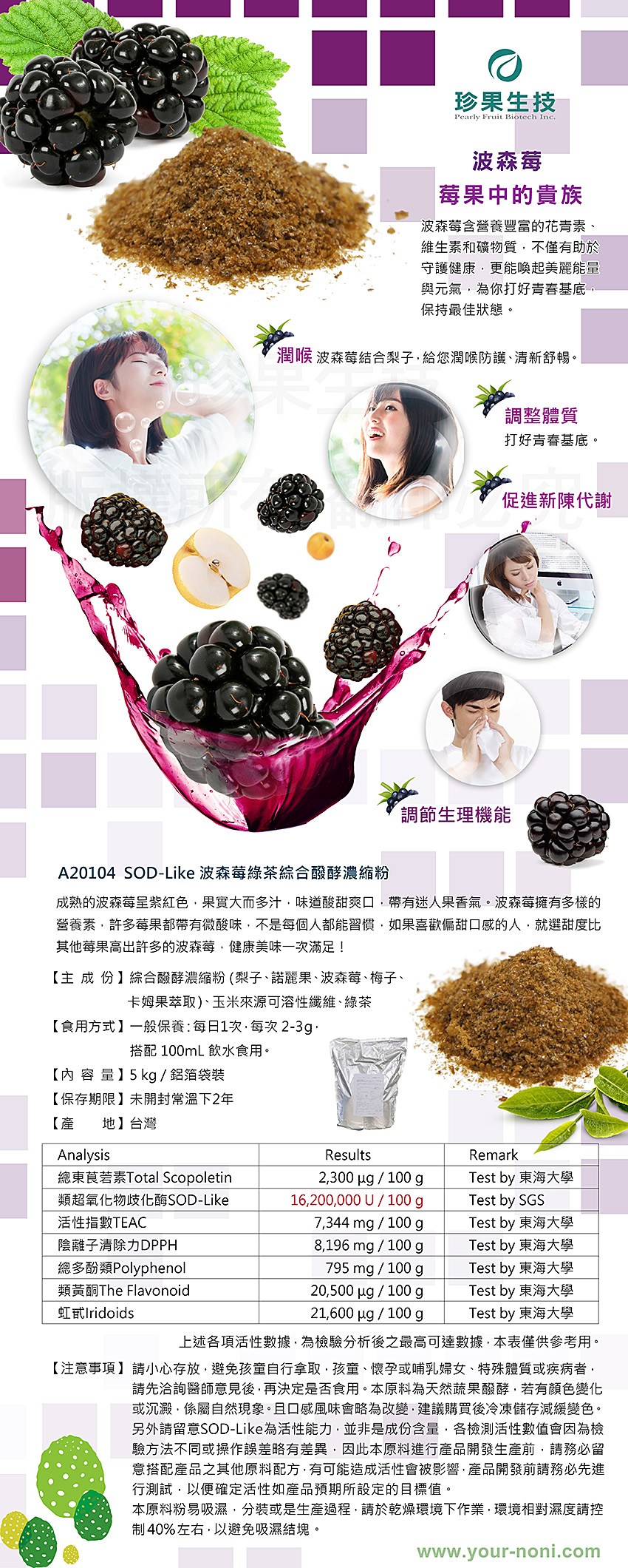 本原料一般消費者無法進行後續加工處理,僅供專業採購商參考,不開放給一般客戶購買,如有任何問題,請與本公司連絡,造成不便 敬請見諒。諾麗,SOD-Like,酵素,boysenberry, noni powder