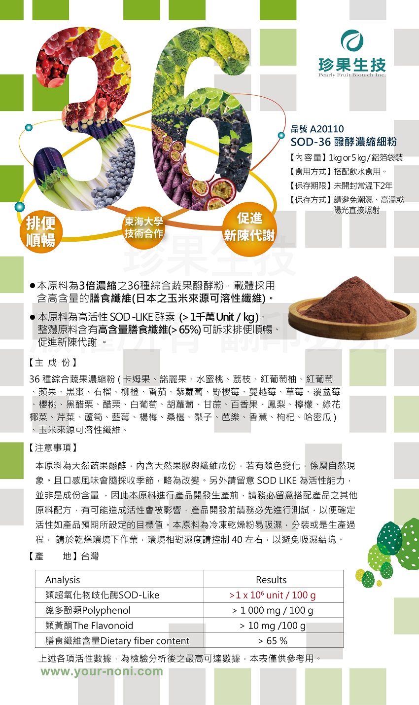 本原料一般消費者無法進行後續加工處理,僅供專業採購商參考,不開放給一般客戶購買,如有任何問題,請與本公司連絡,造成不便 敬請見諒。諾麗,SOD-Like,酵素