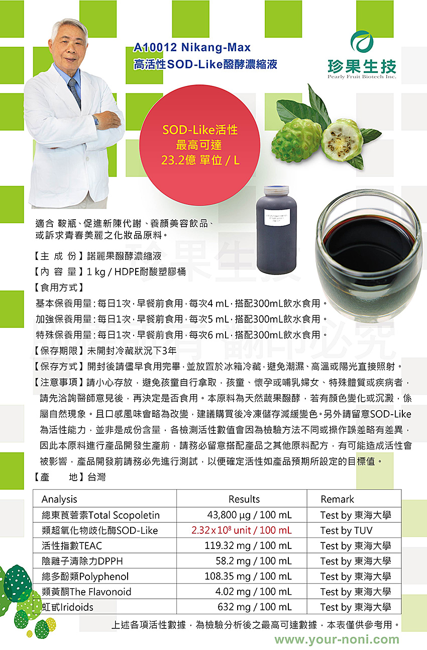 本原料一般消費者無法進行後續加工處理,僅供專業採購商參考,不開放給一般客戶購買,如有任何問題,請與本公司連絡,造成不便 敬請見諒。諾麗,SOD-Like,酵素
