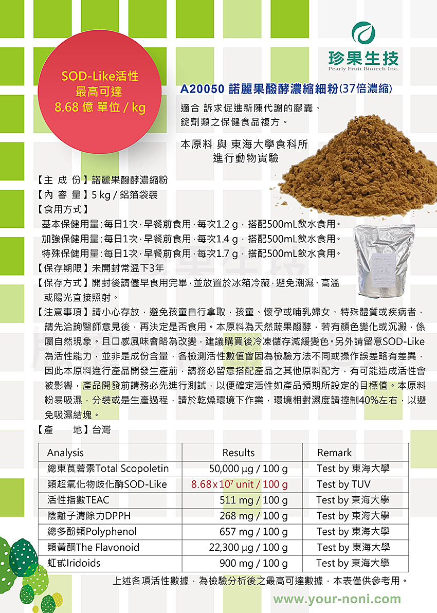 本原料一般消費者無法進行後續加工處理,僅供專業採購商參考,不開放給一般客戶購買,如有任何問題,請與本公司連絡,造成不便 敬請見諒。諾麗,SOD-Like,酵素,純諾麗粉,發酵粉,高活性,noni