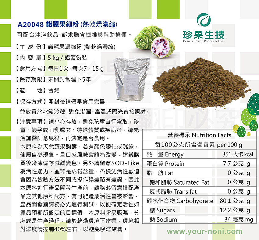 本原料一般消費者無法進行後續加工處理,僅供專業採購商參考,不開放給一般客戶購買,如有任何問題,請與本公司連絡,造成不便 敬請見諒。諾麗,SOD-Like,酵素,noni powder, high sod activity