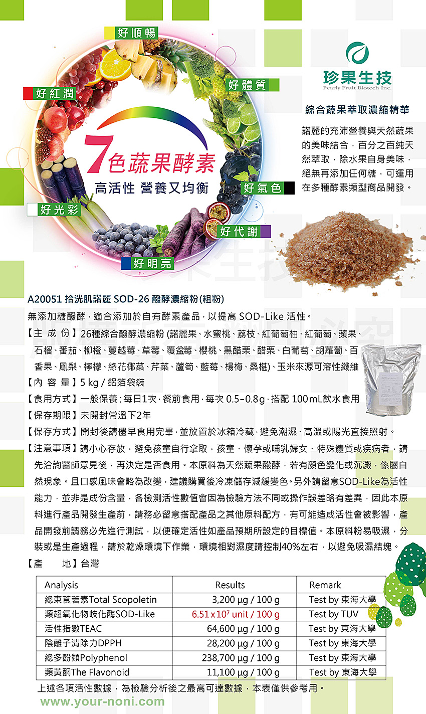 本原料一般消費者無法進行後續加工處理,僅供專業採購商參考,不開放給一般客戶購買,如有任何問題,請與本公司連絡,造成不便 敬請見諒。諾麗,SOD-Like,酵素