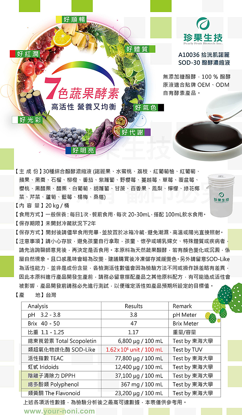 本原料一般消費者無法進行後續加工處理,僅供專業採購商參考,不開放給一般客戶購買,如有任何問題,請與本公司連絡,造成不便 敬請見諒。諾麗,SOD-Like,酵素,綜合蔬果,水果,發酵,酵素,noni,sod