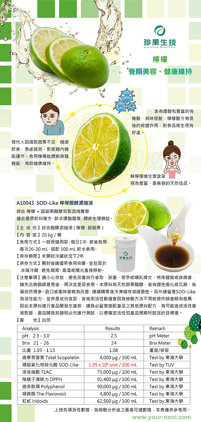 本原料一般消費者無法進行後續加工處理,僅供專業採購商參考,不開放給一般客戶購買,如有任何問題,請與本公司連絡,造成不便 敬請見諒。諾麗,SOD-Like,酵素