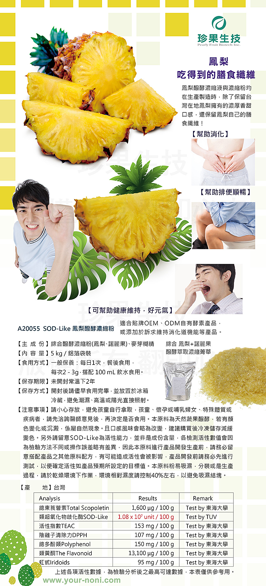 本原料一般消費者無法進行後續加工處理,僅供專業採購商參考,不開放給一般客戶購買,如有任何問題,請與本公司連絡,造成不便 敬請見諒。諾麗,SOD-Like,酵素