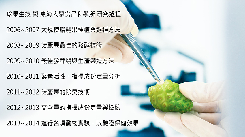 台灣珍果生技,致力於台灣諾麗果的研究,為了確保珍貴的諾麗果,能具備最佳的養生功效,因此,與東海大學食科所共同進行了多年的合作,以研究出最適合諾麗果的特殊生產技術,並於東海大學食品加工廠中,設立了諾麗果研究中心,以找尋能完整保留珍貴活性成份的最佳技術。