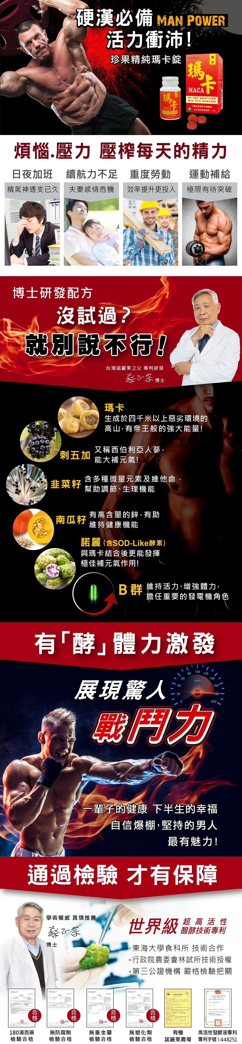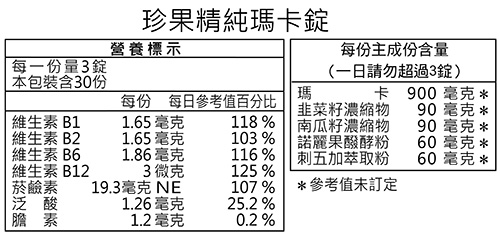 【主 成 份】瑪卡、韭菜籽濃縮物(韭菜籽濃縮物、麥芽糊精)、南瓜籽濃縮物(南瓜籽濃縮物、麥芽糊精)、諾麗果醱酵濃縮粉、刺五加萃取粉(刺五加萃取物、麥芽糊精)、綜合維生素B群(菸鹼醯胺、乳糖、鹽酸吡哆辛(維生素B6)、鹽酸硫胺明(維生素B1)、核黃素(維生素B2)、本多酸鈣、重酒石酸膽鹼、氰鈷胺明(維生素B12)、二氧化矽)